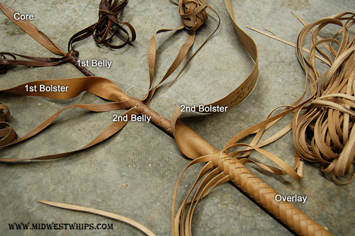 Then braid the first belly, secure a bolster around it, and braid the second belly. (These cover the handle spike and extend well into the thong) this helps to strengthen the transition from handle to thong - the place where older or not-so-sturdily made whips have a tendency to break down.