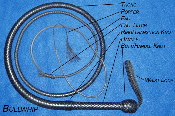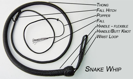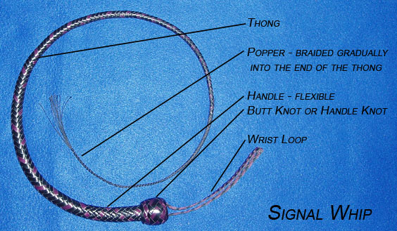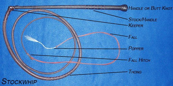 All sorts of whips share many of the same names for their parts, but listed below are labelled pictures of a stockwhip, a bullwhip, a signal whip, and a snake whip. Scroll on down below the pictures for definitions and explanations of the terms used.